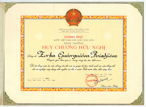 DEMOCRATIC REPUBLIC OF VIETNAM THE GOVERNMENT Comrade Zorka Guéorguiéva Boidajiéva To express our gratitude for your dedicated support to the comrades for the cause of building socialism in the Democratic Republic of Vietnam. February 22, 1961 INTO GOLD REGISTER NUMBER 1886 |