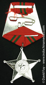 | Obverse: | in the center a red disk with a small gold (sometimes silver ?) star, surrounded in red with gold inscription above "HUAN CHUONG" and below "CHIEN CONG", on a star with balled points; | |||
